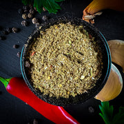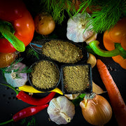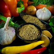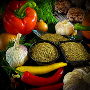 Sastāvs: sāls, koriandrs malts, sinepju pulveris, ķiploku granulas kaltētas, baziliks kaltēts, burkānu granulas kaltētas, sinepju sēklas, pētersīļi kaltēti, sīpolu granulas kaltētas, majorāns kaltēts, saldās paprikas pulveris, pipari melni malti, čili malti, dilles kaltētas, timiāns kaltēts, oregano