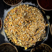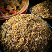 Sastāvs: sāls, koriandrs malts, ķiploku granulas, fenugreks malts, ķiploku granulas, timiāns, sarkana paprika, pretsalipes viela rapšu eļļa, saldās paprikas pulveris.