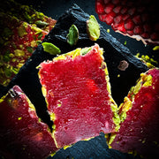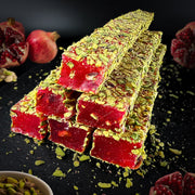 Lukumu klasika – granātābola batoniņš ar pistācijām. Garša ir saldskāba. Tekstūra ir elastīga. Kraukšķīgas, apceptas pistāciju skaidiņas veido perfektu kombināciju ar lukuma granātābola garšu.