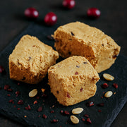 Neparasta, bet ļoti garšīga zemesriekstu halvas un žāvētu dzērveņu kombinācija. Dzērveņu vieglais skābums mīkstina halvas saldumu. Katrs kumoss ir gardēža prieks! Visiem dzērveņu cienītājiem tas patiks!