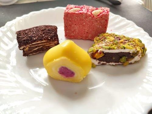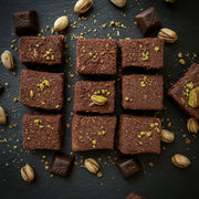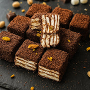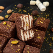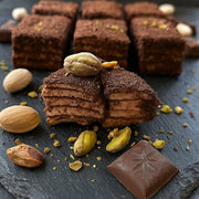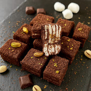 Kārtainā lukuma kūka ar šokolādi un pistācijām. Viena kārta - vaniļas pastila kārta, otra šokolādes kārta. Lukums izskatās kā maza kvadrātveida šokolādes kūka.