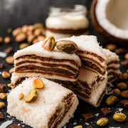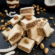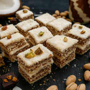 Kārtains vaniļas-šokolādes baudījums. Zem kokosa pārkaisījuma slēpjas vaniļas spilventiņš ar šokolādes krēmu "nutella". Iekšā ir lieli pistāciju gabaliņi. Pistāciju gabaliņi ir viegli apcepti, ar ļoti vieglu sāļu pēcgaršu, maigi un kraukšķīgi. Šokolādes slānis ir biezs un ļoti gards. Lukums izskatās pēc mazas kūciņas!