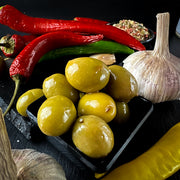 Sastāvs: zaļās olīvas ar kauliņiem, ūdens, saulespuķu eļļa, sāls, ķiploki, etiķis, garšas pastiprinātāji, garšvielu maisījums, aromatizētāji, konservanti, skābe, antioksidants