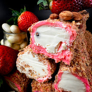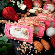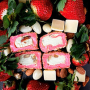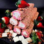 В состав входят: cukurs, гликозовые сиропы, kukurūzas ciete, zemeņu sula, baltas šokolades krēms, mandeles, lazdu rieksti, dabīgs aromāts, dabīgas pārtikas krāsvielas.
